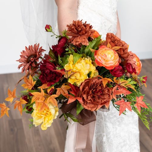 By rotating the Foliage Crescent vertically (rather than horizontally), you instantly get the gradual taper needed for a teardrop-style bouquet. Add silk or fresh blooms to create a compact, formal look, while the crescent delivers structure and graceful greenery.